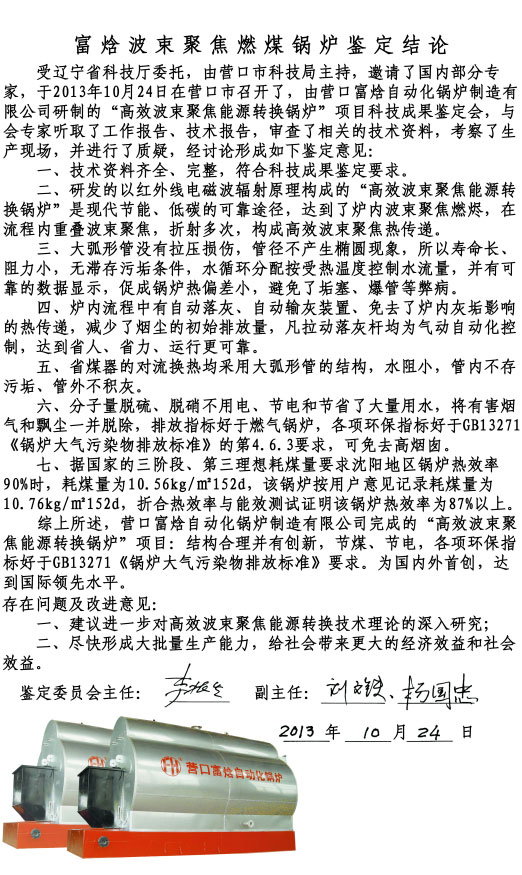 “富焓波束、聚焦燃煤鍋爐”經(jīng)省科技廳鑒定結(jié)論為“國(guó)內(nèi)外首創(chuàng),達(dá)到國(guó)際領(lǐng)先水平”。